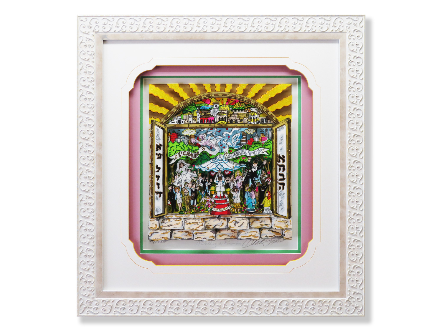 「L'Chaim=乾杯」「 Mazel tov=おめでとう」とヘブライ語での祝福を愛の象徴である鳩が届けているハッピーな作品です。
